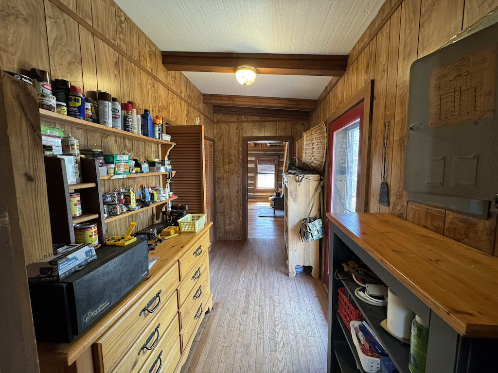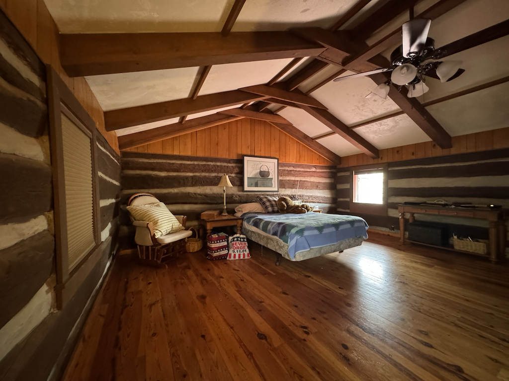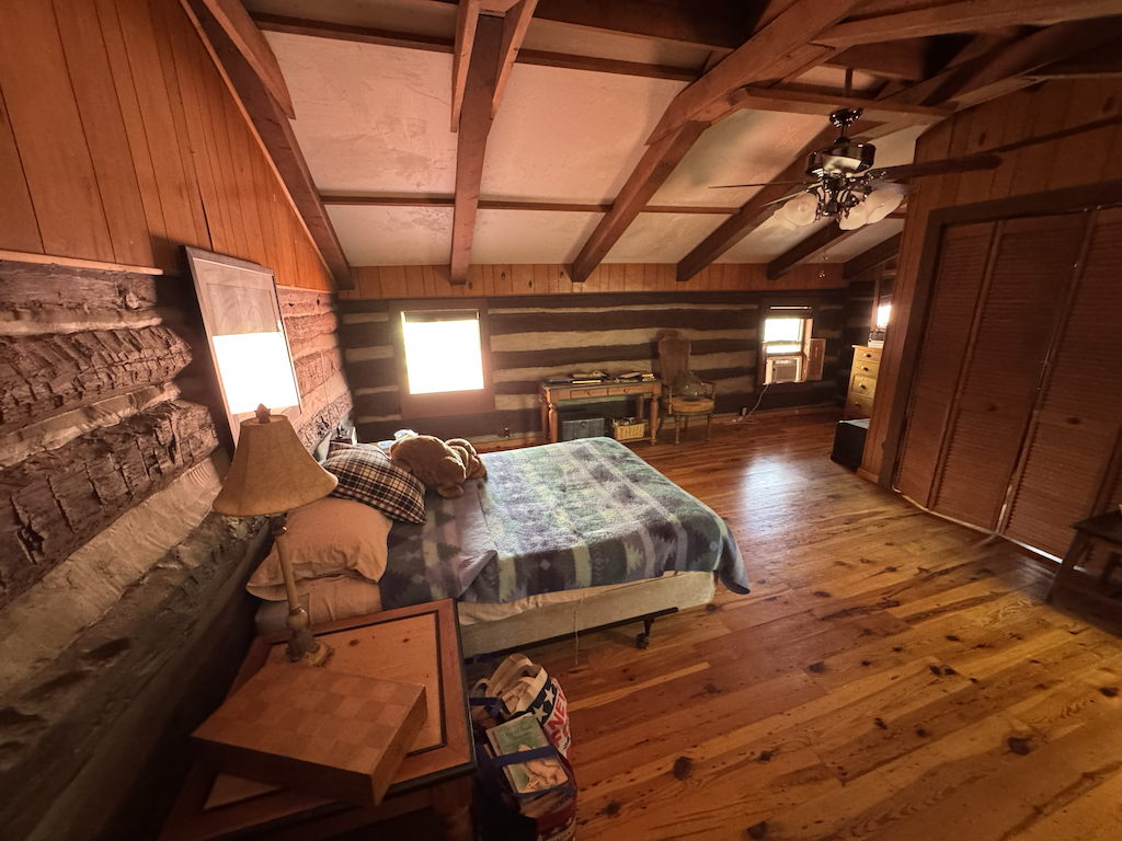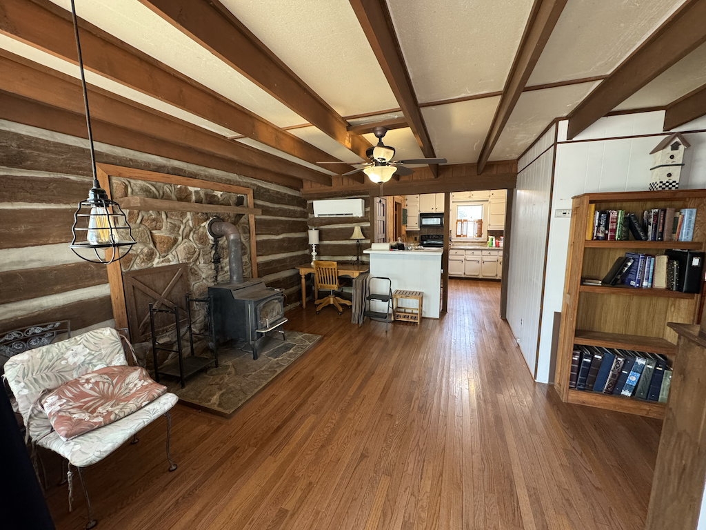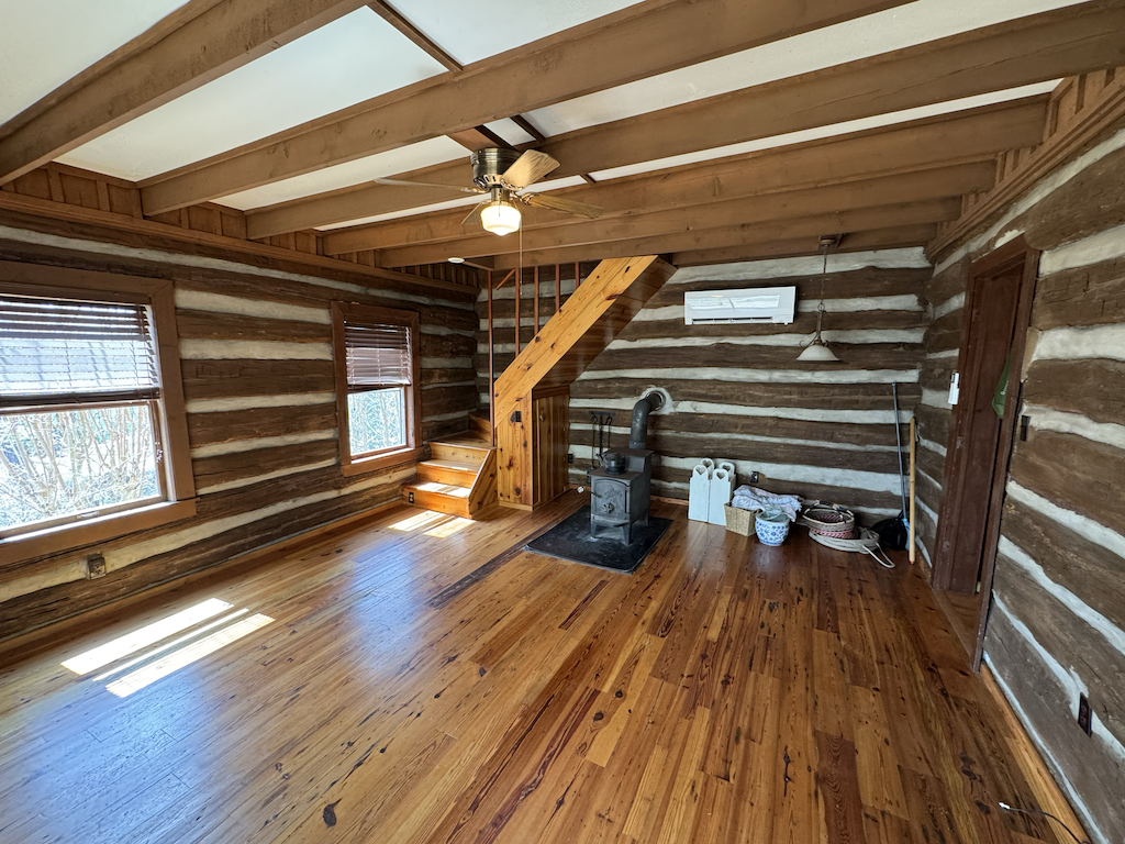 The log home has +/- 1,644 sq ft with two separate living areas. Both sides of the home have their own staircase leading to an upstairs bedroom, along with a bathroom located adjacent to each living space both with their own wood stove. There is plenty of flexibility to create a setup that works well for guests, multi-family use, or added privacy. The home is served by a private well and septic system and is equipped with mini-split heating and air for year-round comfort.